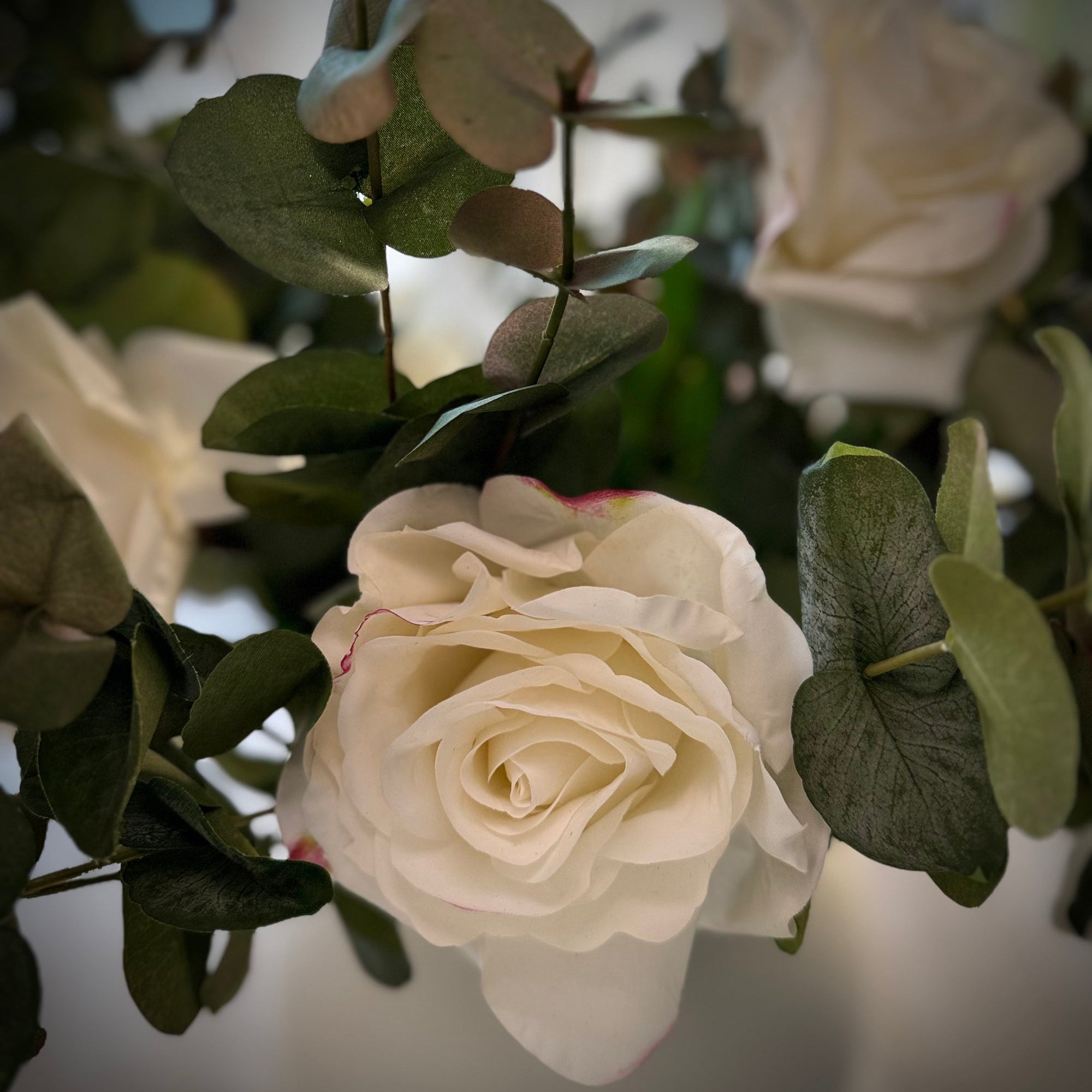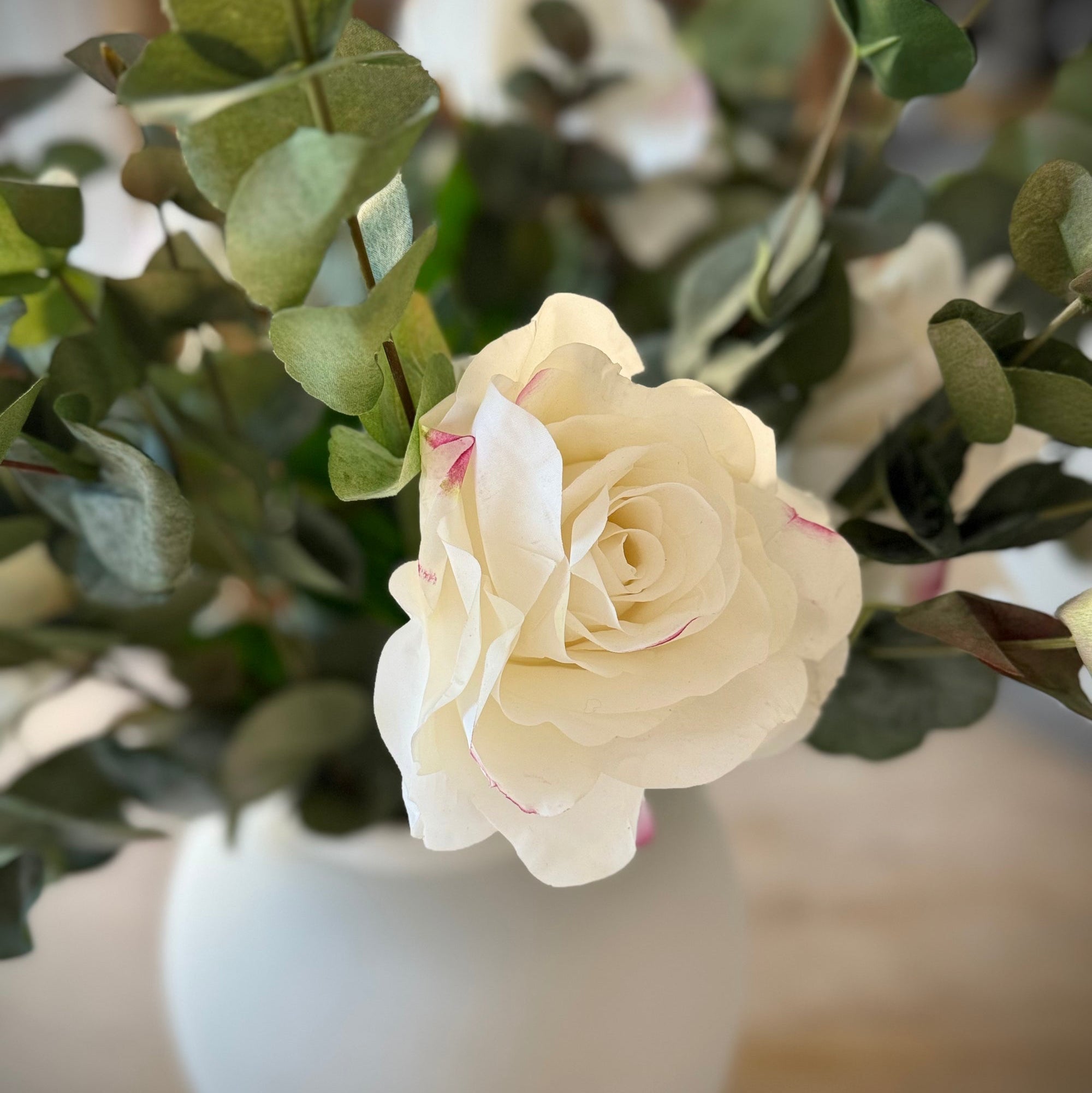 The Sophia Arrangement showcases exquisitely lifelike roses — crafted with real-touch petals that capture the softness and subtle variation of fresh blooms. Paired with natural-looking eucalyptus for texture and depth, each stem is arranged to feel freshly gathered and beautifully balanced.