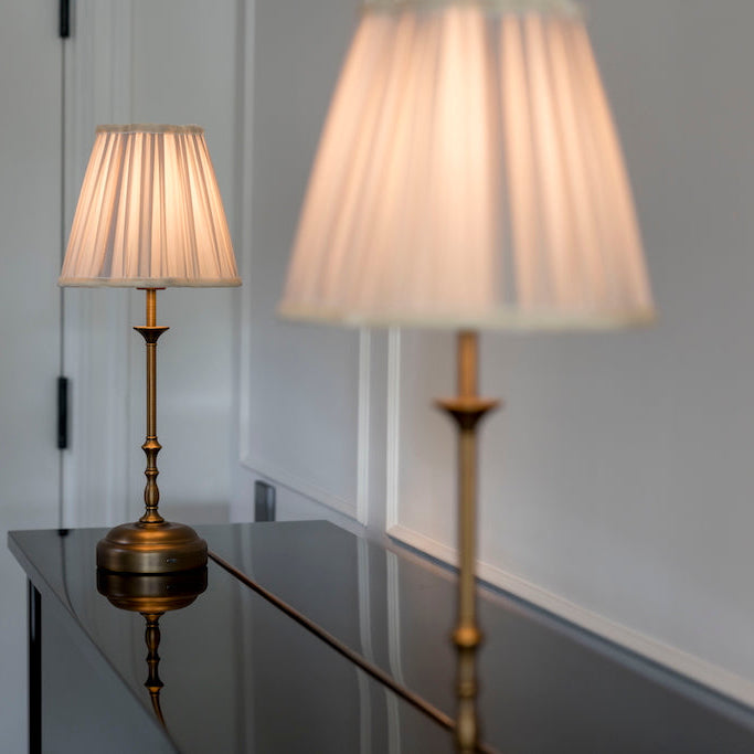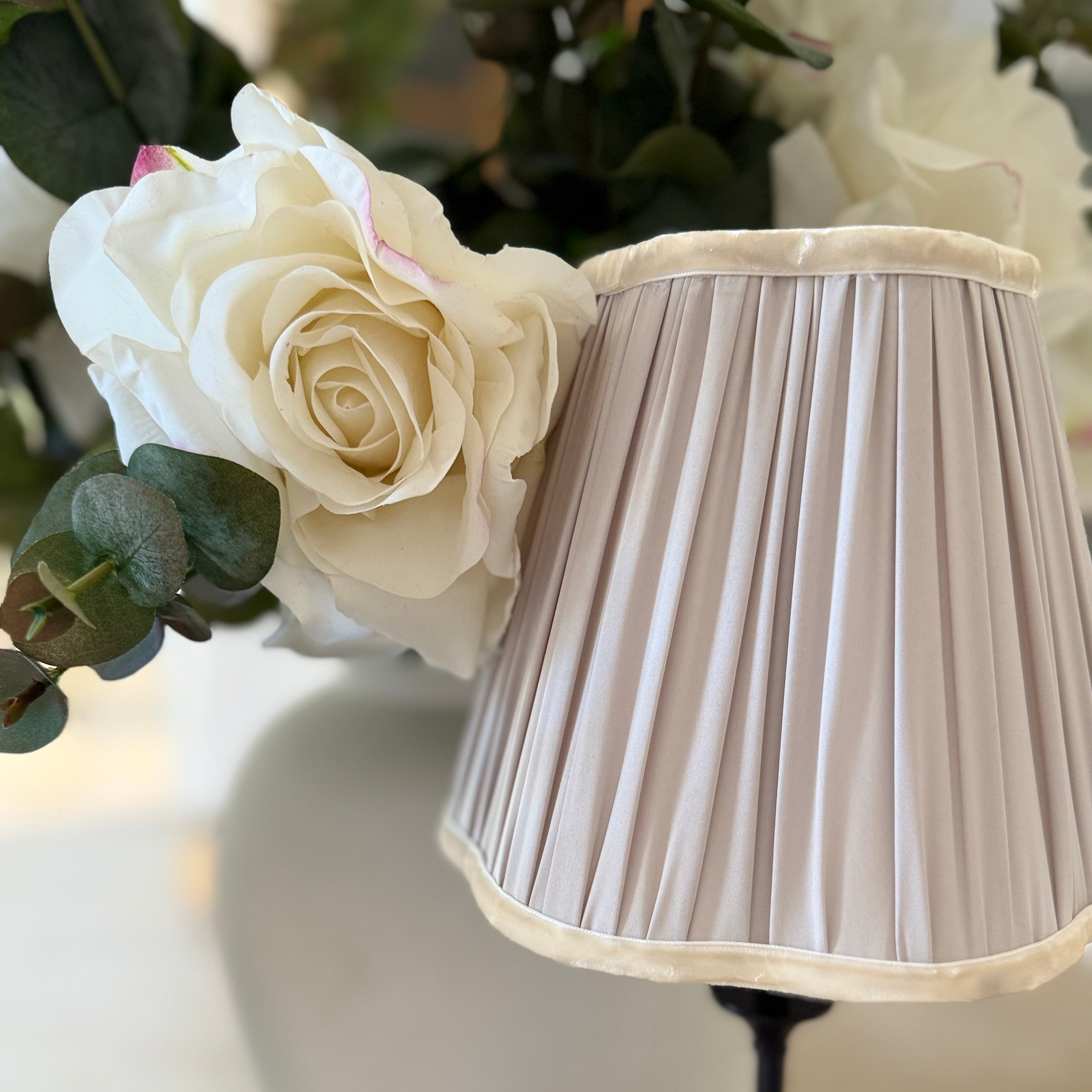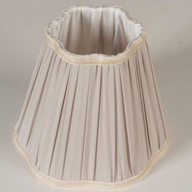 This dove grey faux silk lampshade is defined by its gentle pleats and scalloped edge in contrasting velvet. The elegant grey shade is lifted by the soft velvet contrast, making it a versatile accent for both modern and traditional interiors.