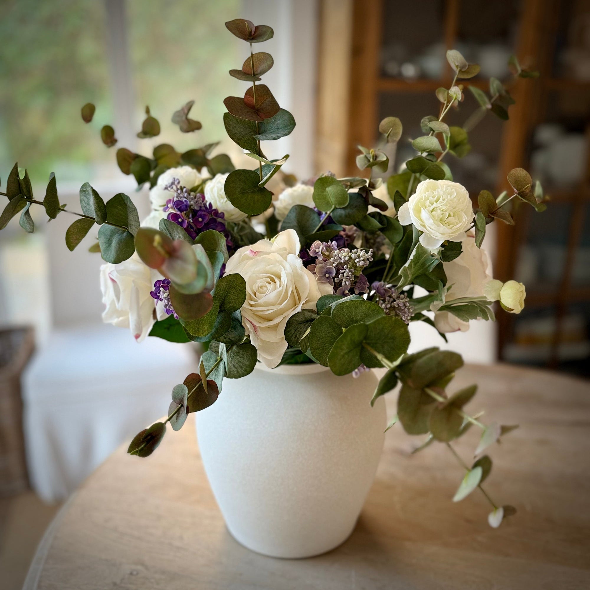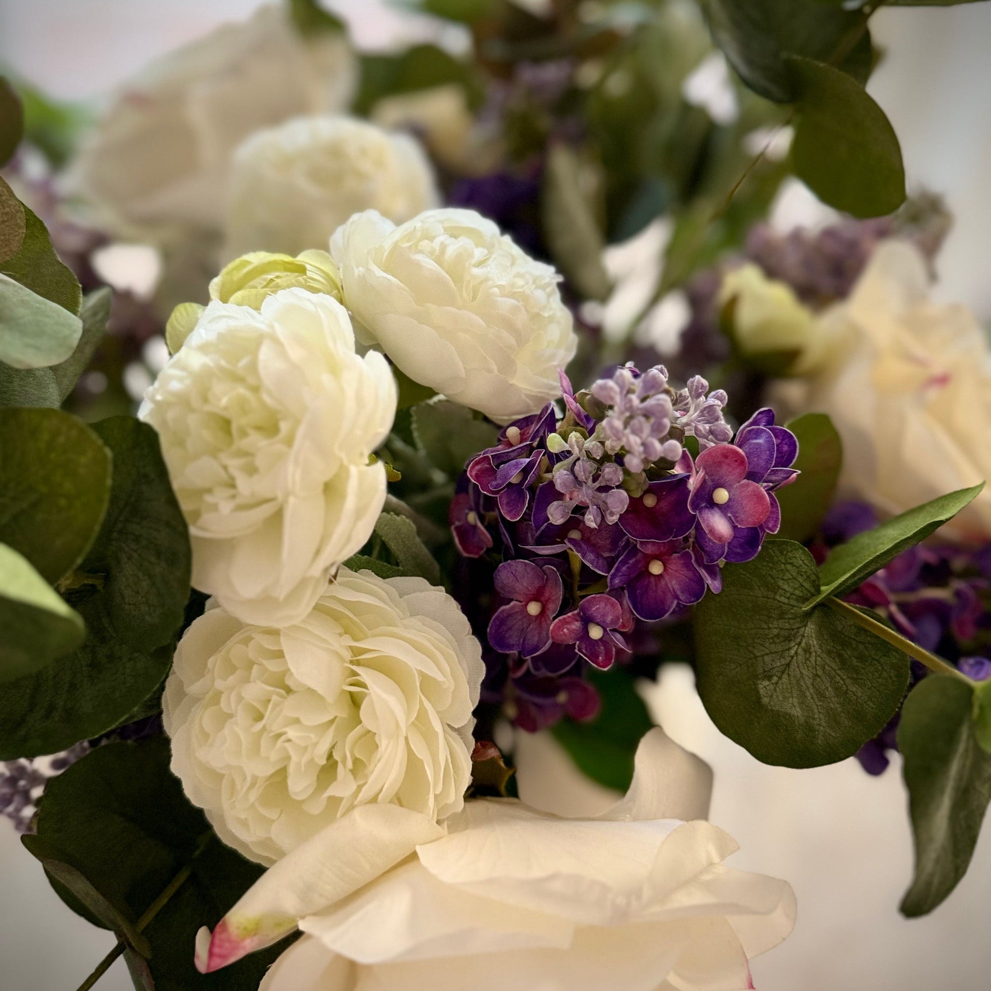 The Flora Heritage Rose Faux Arrangement layers real-touch roses with lilacs, ranunculus and eucalyptus for a softly romantic presence. Dark and light purple lilacs add tonal depth, balanced by the rich green of eucalyptus.