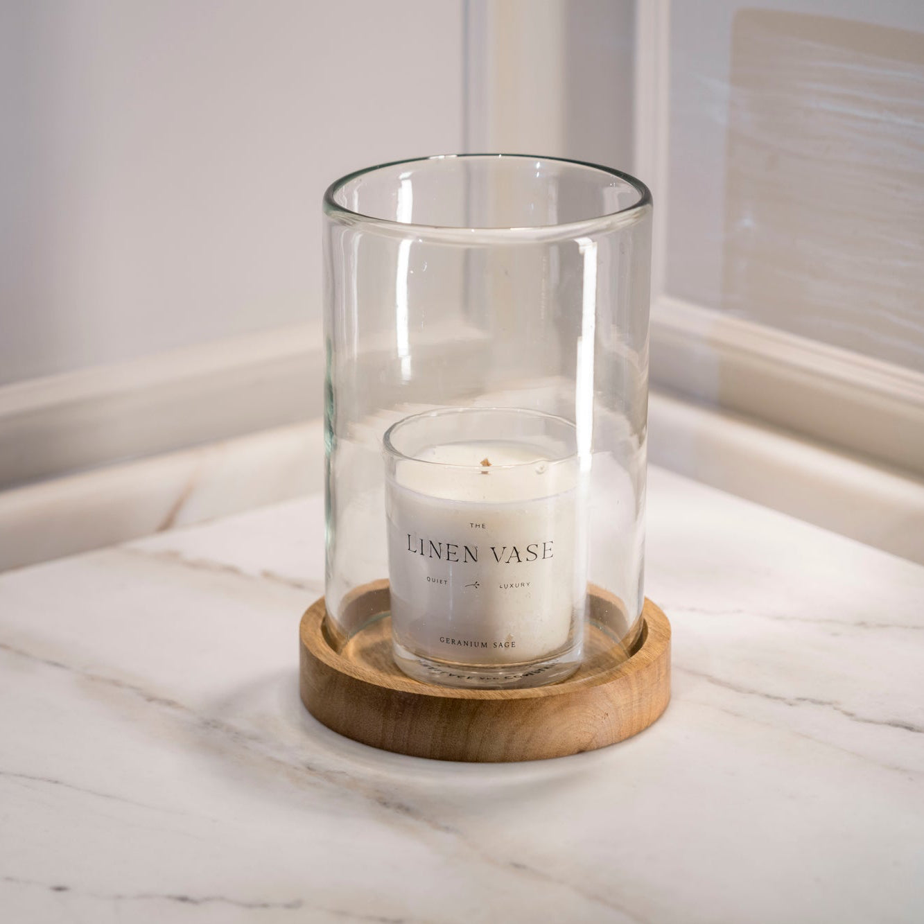 The Haven Wood and Glass Candle Holder brings together natural mango wood and softly contoured soda-lime glass to create an inviting play of texture and light. Whether styled alone or in pairs, it creates an inviting glow to any setting.