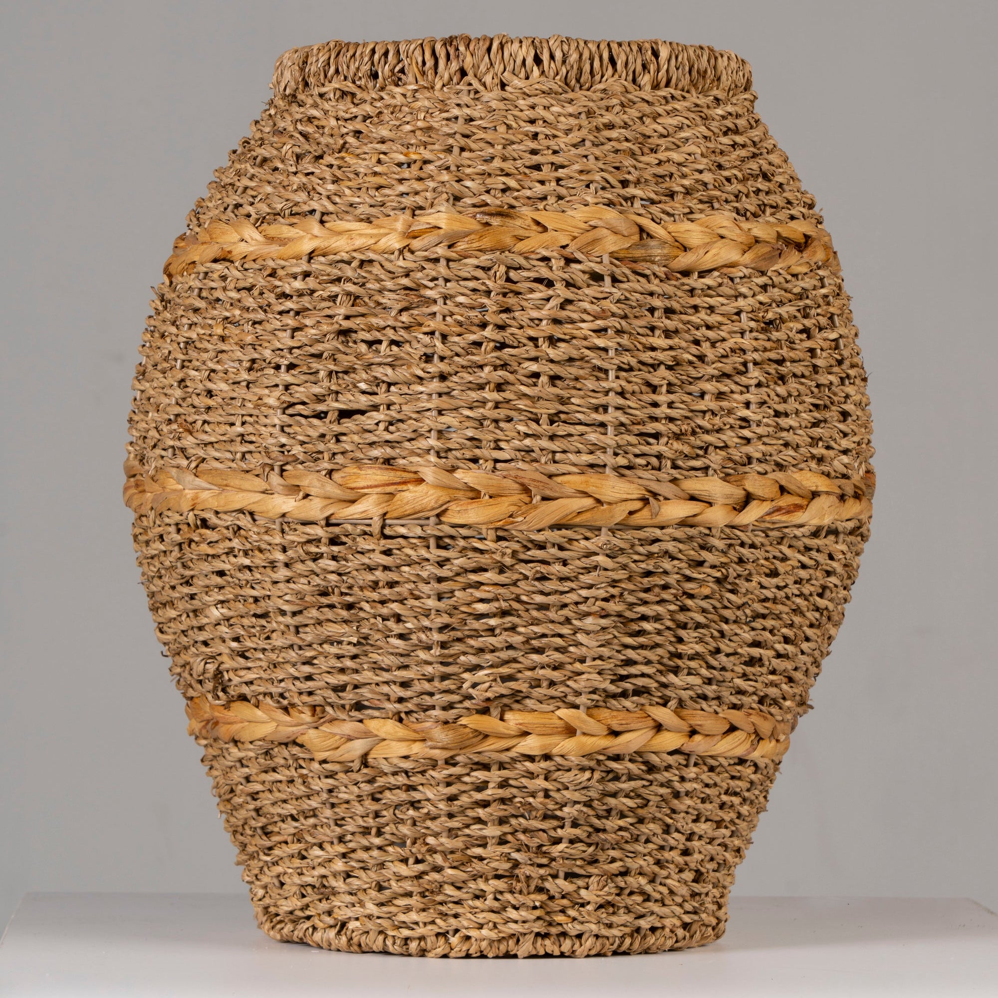 Handwoven in Vietnam from natural seagrass, the Mira Vase is a statement floor piece that brings sculptural texture and organic warmth to interior spaces.