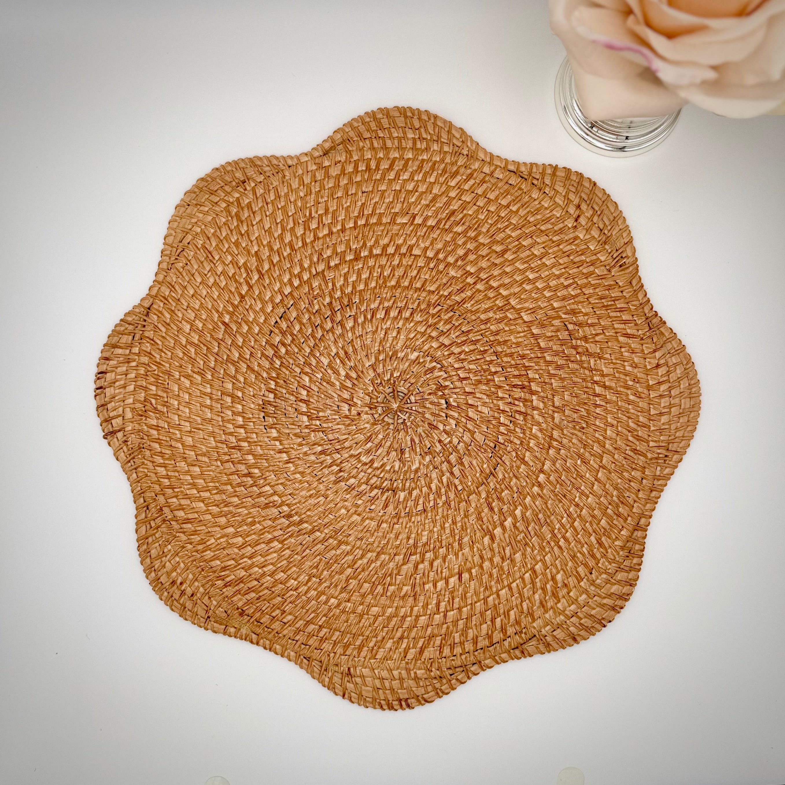 The Willa Rattan Scalloped Edged Placemats bring a sense of calm refinement to the table—natural woven texture, softened by a gently scalloped edge that feels decorative without feeling fussy. The natural rattan tone adds warmth and depth, pairing beautifully with crisp whites, soft neutrals, and layered linens for an effortlessly considered setting.